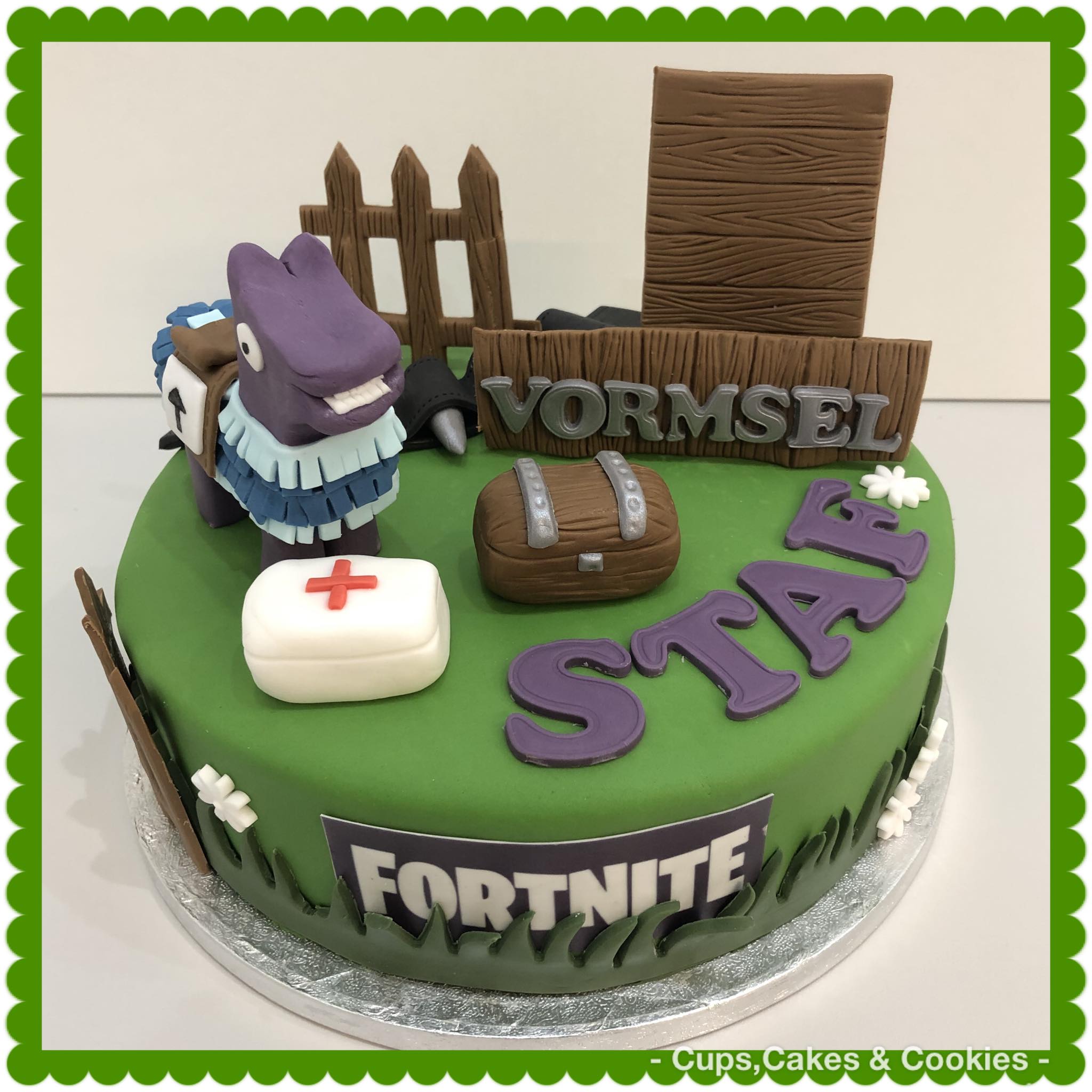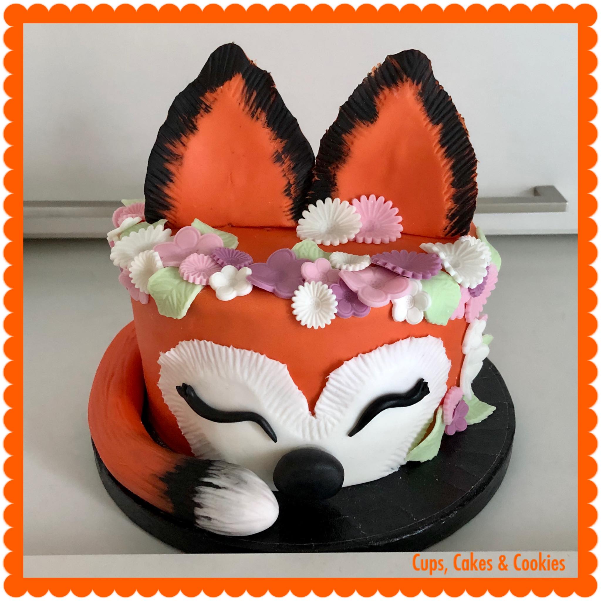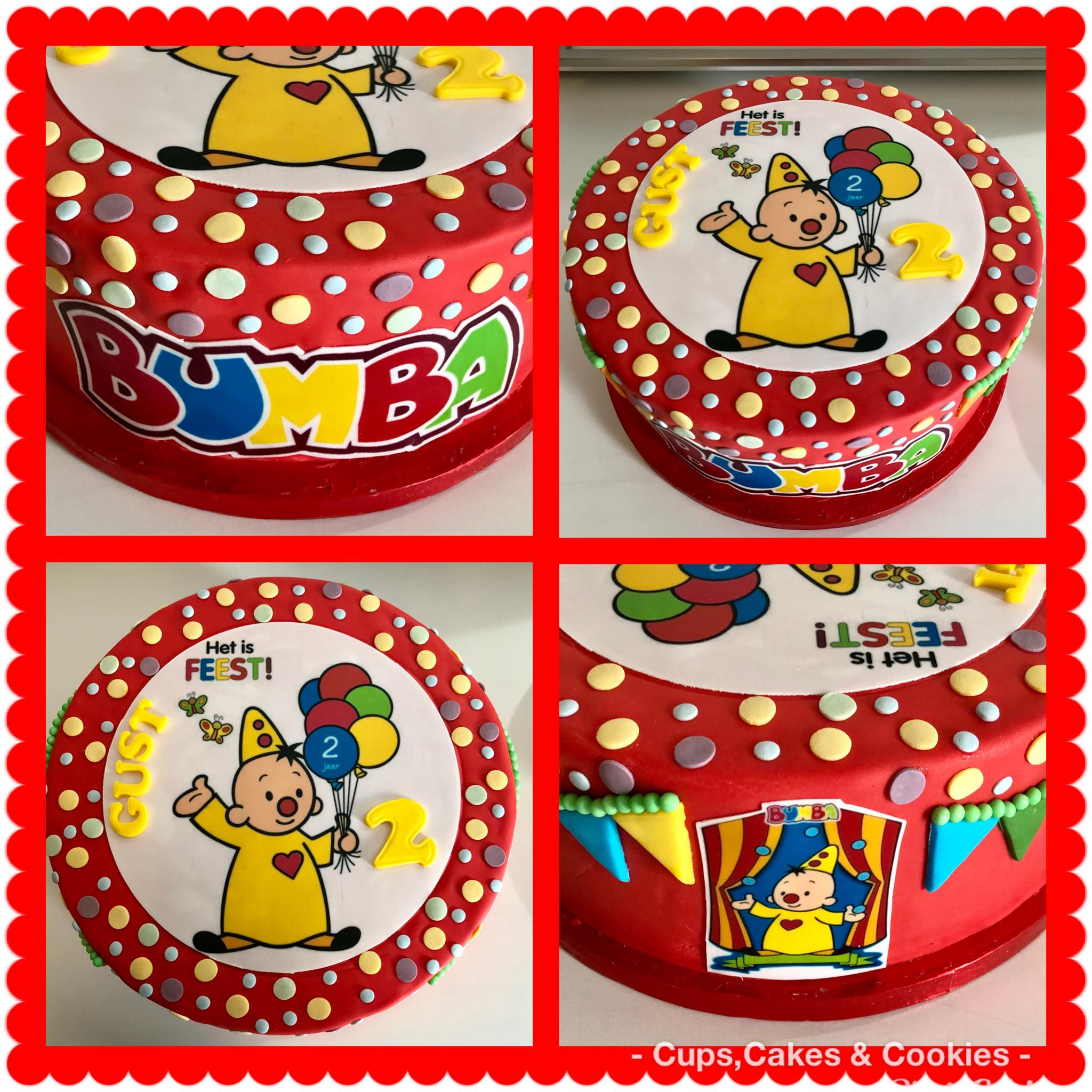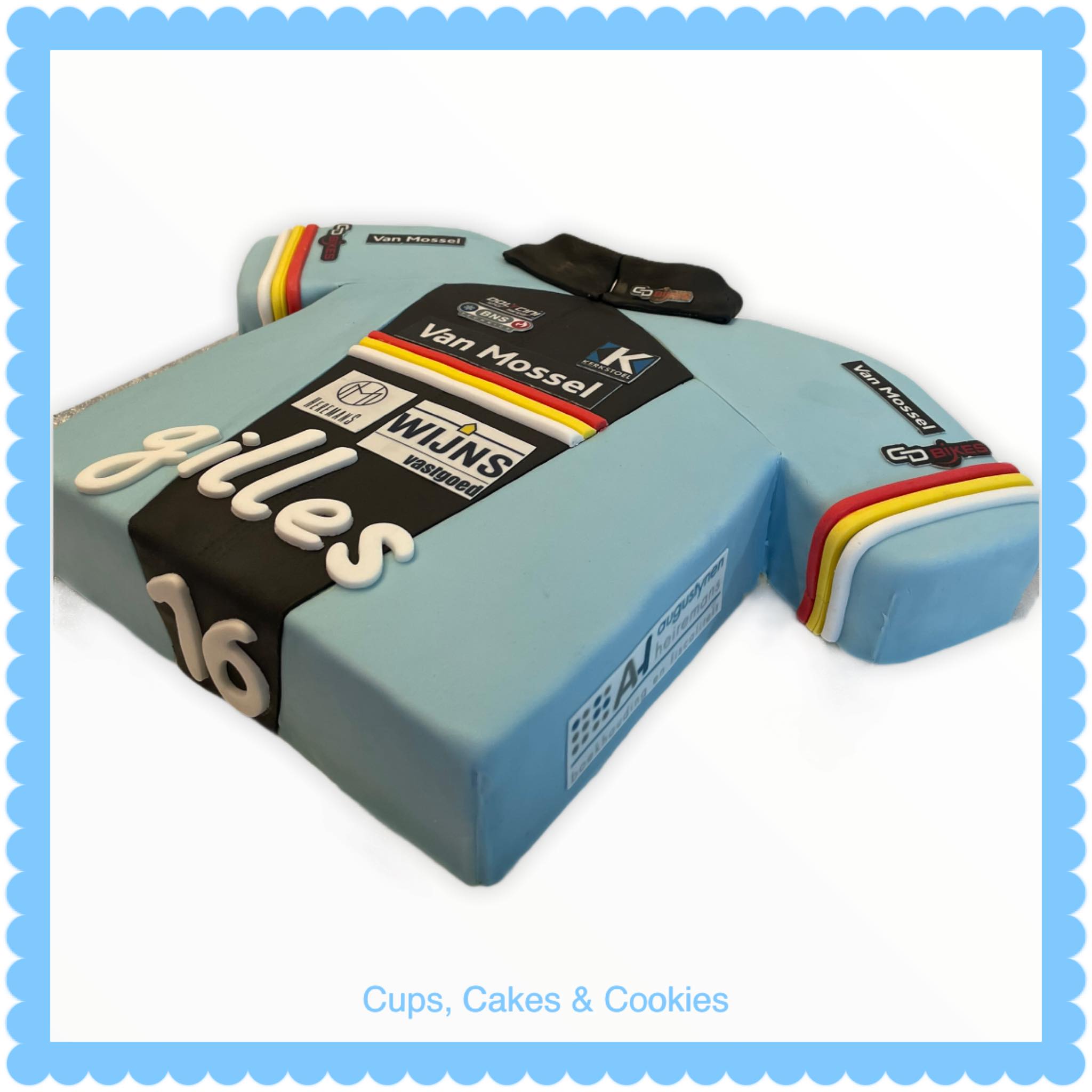 Deze taart is volledig met fondant (=suikerpasta) overtrokken.