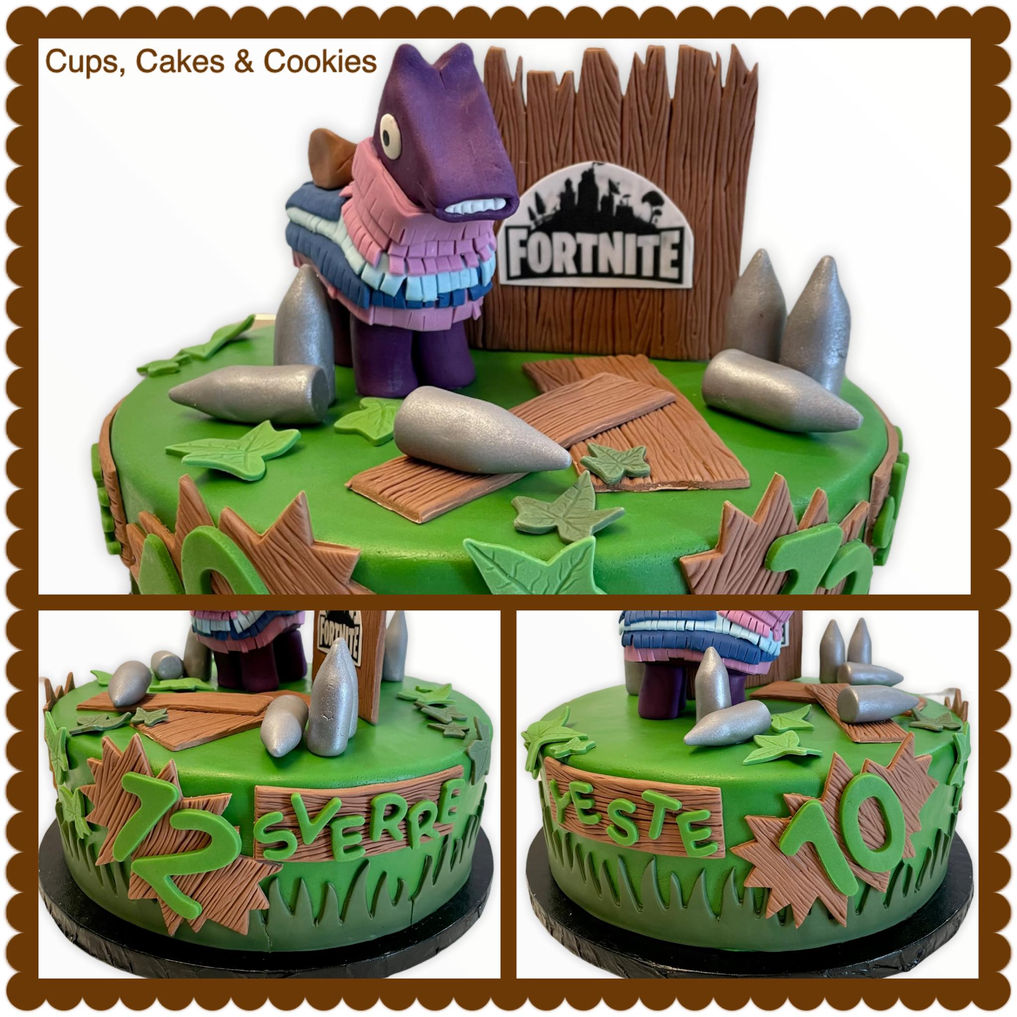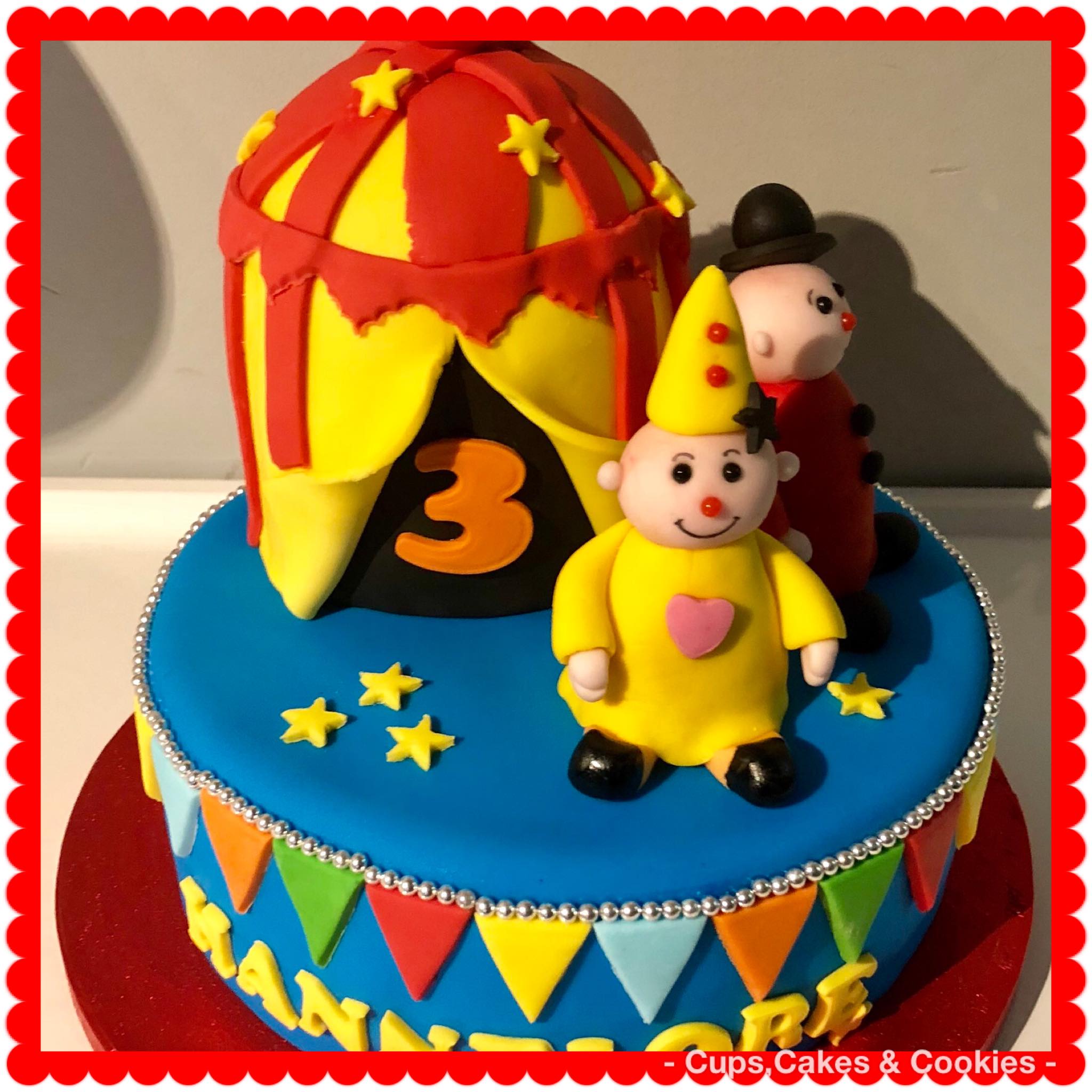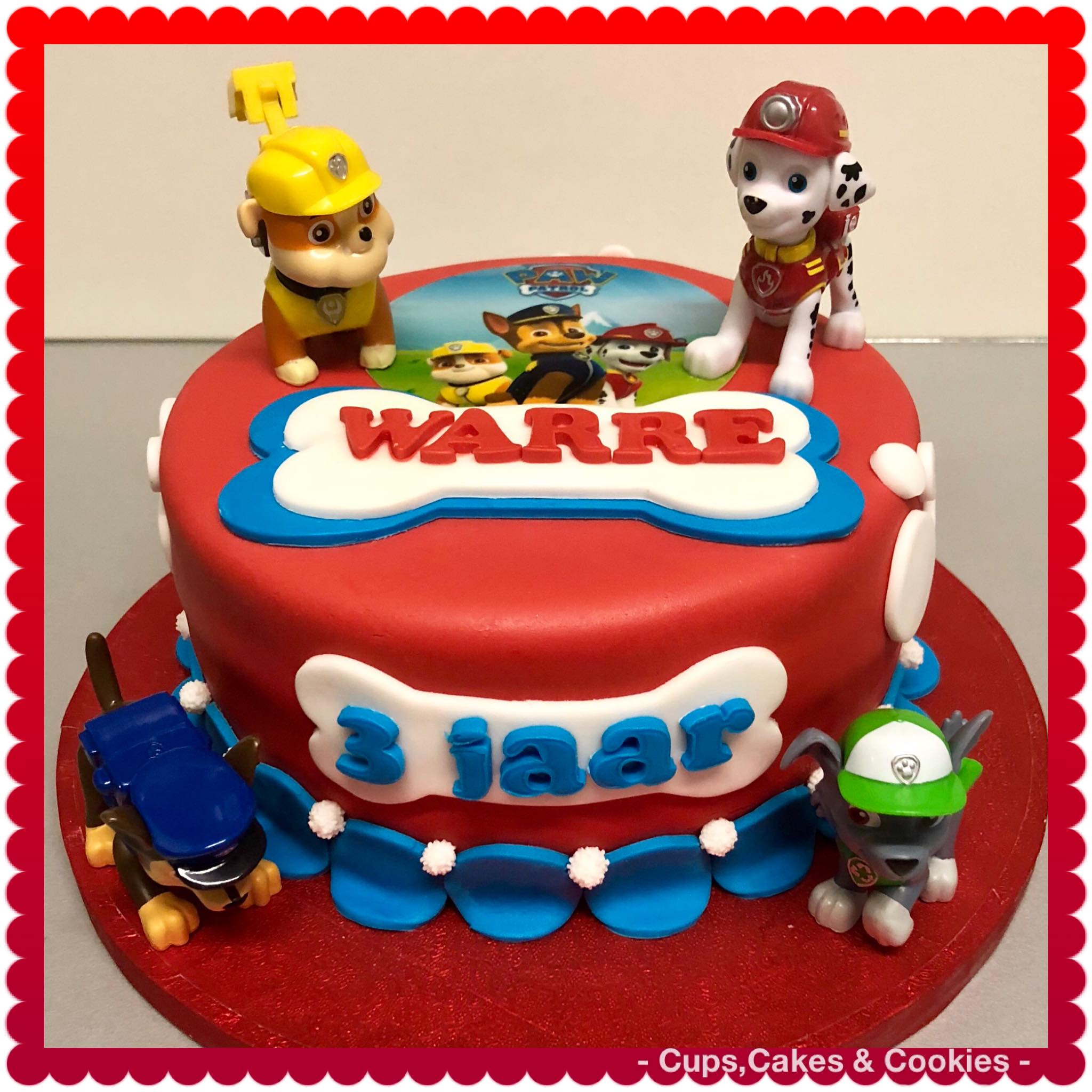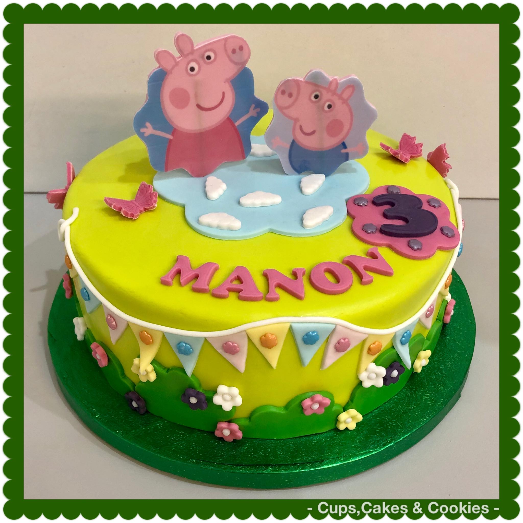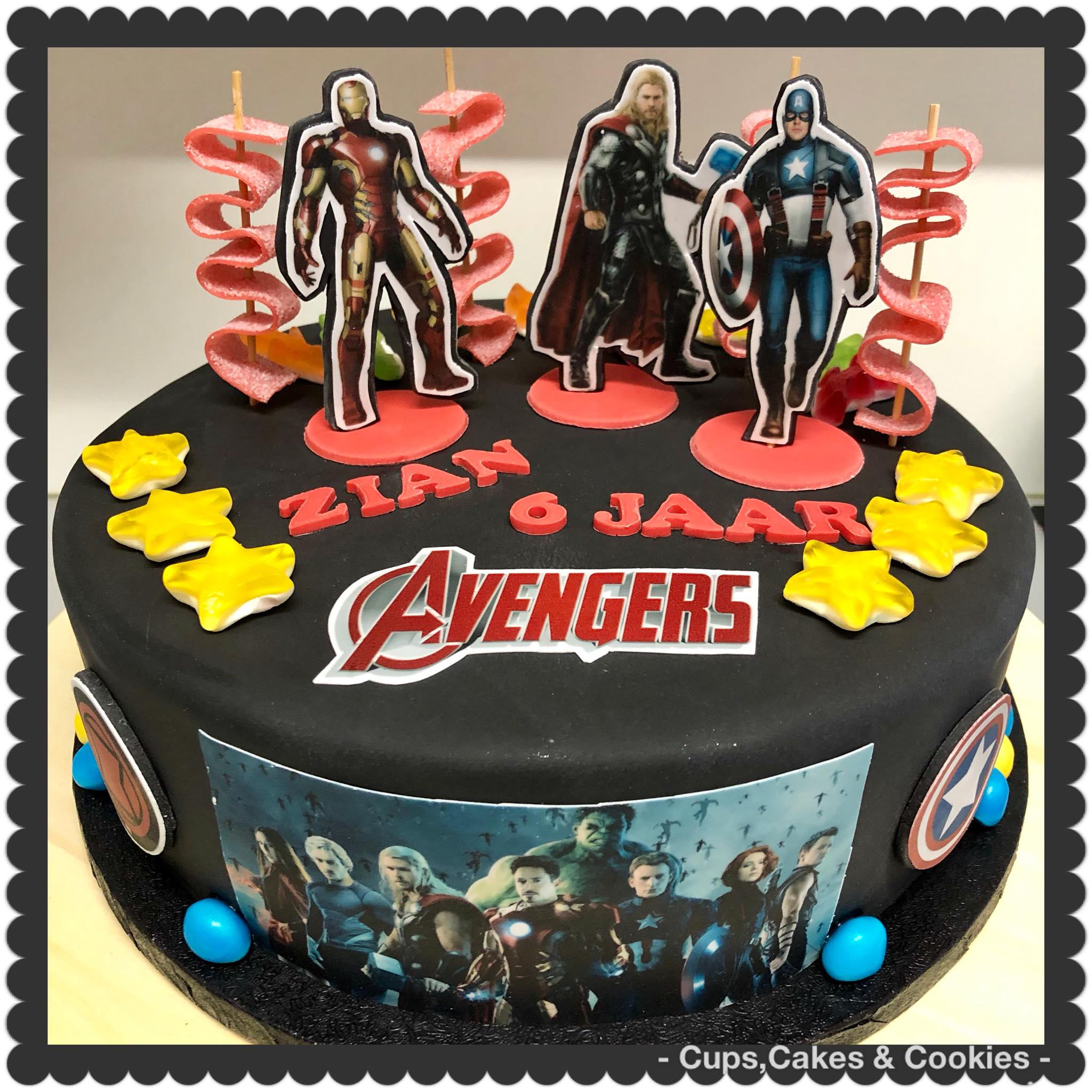 Deze taart is volledig met fondant (=suikerpasta) overtrokken.